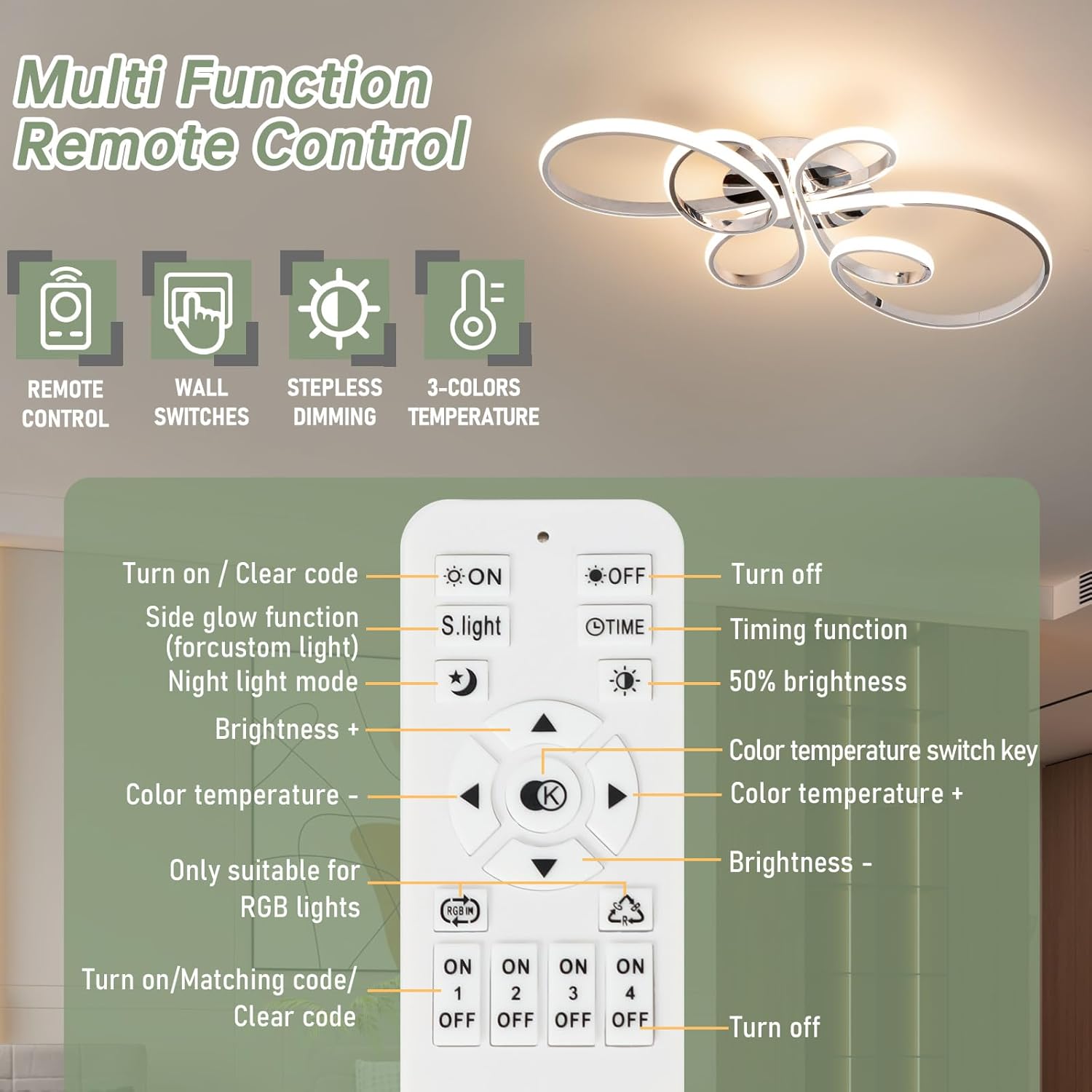 Dimmable with Remote Convenience - The flower-shaped LED ceiling light offers seamless brightness adjustment from 10% to 100% and color temperature control from 3000K to 6500K, all via a user-friendly remote. Alternatively, simply utilize the wall switch to switch between warm white (3000K), neutral light (4000K), and cool white (6500K) settings, ensuring the perfect ambiance for any occasion.Flower ceiling light supports both remote control and APP control. You can use the remote control and APP to adjust the color temperature and brightness according to your preference, with timer off, memory function and night light mode.
