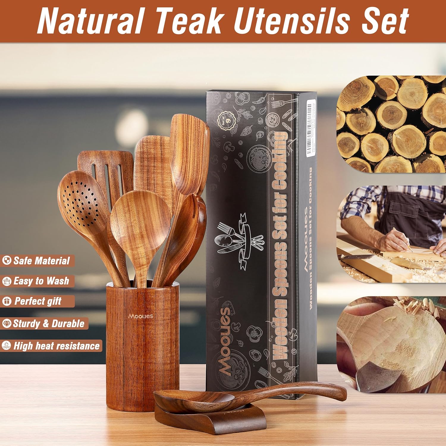9 Piece Natural Teak Wooden Kitchen Utensil Set with Spoon Rest - Comfort Grip Cooking Spoons and Utensils Holder