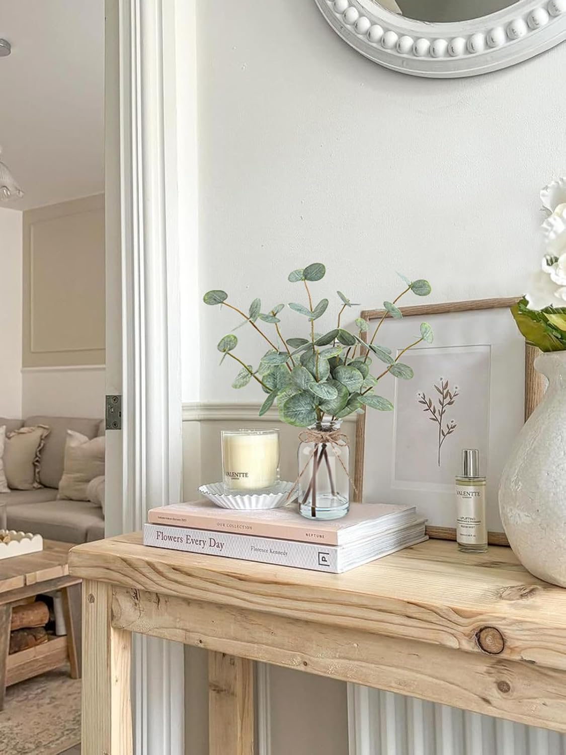 Artificial Plant with Vase: Fake eucalyptus stems are in a beautiful glass vase with realistic artificial water, providing stability and a natural look. Perfect for any space, it enhances your home’s comfort and beauty.