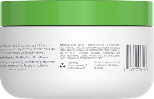Care for your dry to very dry skin with CETAPHIL Moisturizing Cream, a non-greasy, moisture rich cream for the whole body. Enriched with sweet almond oil and vitamin E, it immediately comforts and instantly hydrates dry, sensitive skin. Formulated with a new blend of key ingredients: hydrating glycerin, panthenol (vitamin B5) to hydrate, soothe and preserve the skin barrier, and niacinamide (vitamin B3) to help smooth skin texture and retain skin moisture barrier. For long lasting hydration, this extra strength face & body moisturizer binds water to the skin to deeply replenish the skins moisture and prevent moisture loss, hydrating and soothing skins dryness for 48 hours and completely restoring the skins moisture barrier in one week. Ideal for very dry areas of skin on the hands, feet, elbows and knees, leaving your skin feeling soft, smooth and nourished. This fragrance free, paraben free, and sulfate free formula will not clog pores and is clinically tested for even the most gentle skin. Effectively defends against 5 signs of skin sensitivity.