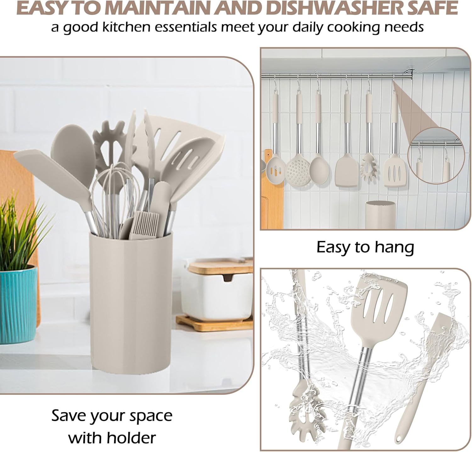 HaWare 29 PCS Silicone Cooking Utensils Set, Heat Resistant Kitchen Utensils Set with Stainless Steel Handle, Spatula Sets with Holder and Hooks, Kitchen Tools Gadgets for Nonstick Cookware -Khaki