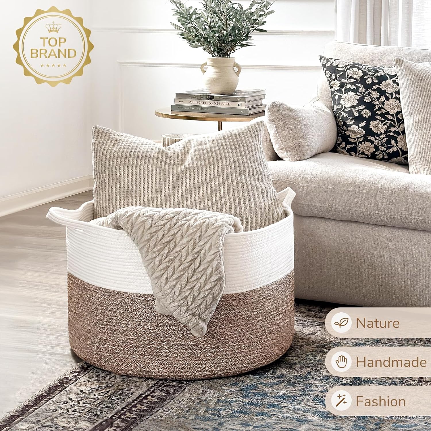 INDRESSME XXXLarge Cotton Rope Basket 21.7" x 21.7" x 13.8" Woven Baby Laundry Blanket Basket Toy Baskets with Handle Storage Comforter Cushions Thread Laundry Hamper Home Decor Living Room